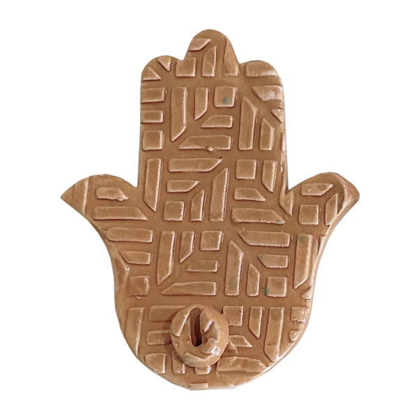 Porta sahumerio con forma de mano de fátima, realizado en cerámica esmaltada.